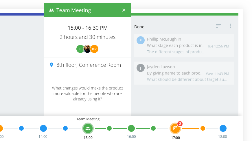 Your daily schedule is visualized in a timeline. Setting up meetings and reminders without leaving your mailbox is a click away.