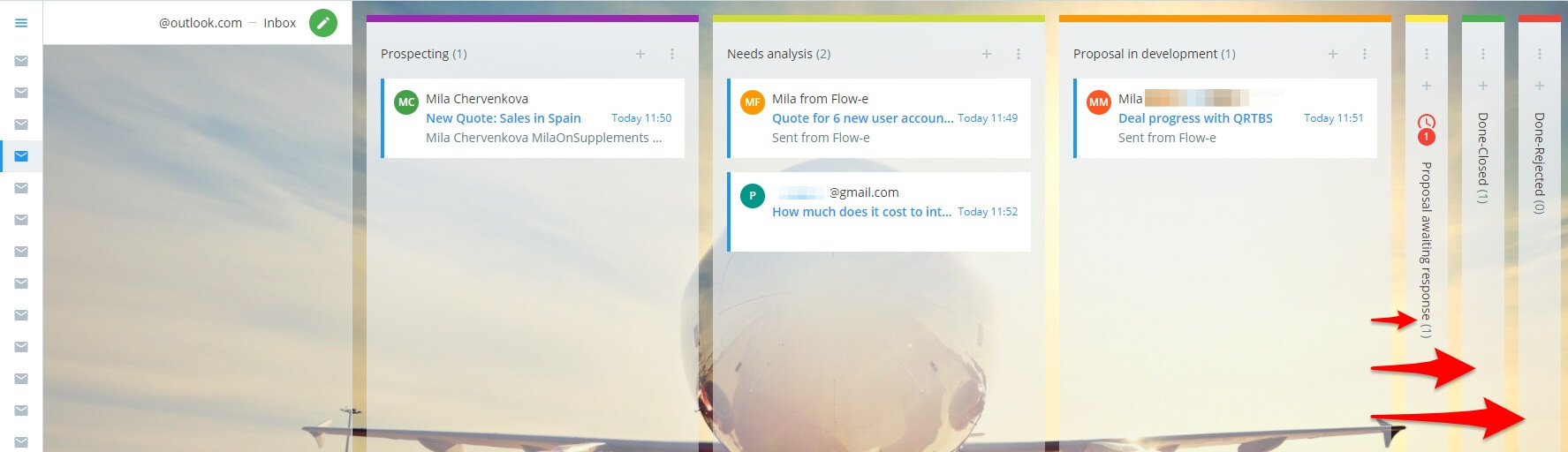 · Prospecting - This is the column where any prospect starts. An email turns into a Kanban card. Any opportunity here becomes qualified or is rejected.